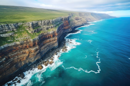 A stunning aerial view of a cliff by the ocean, where the fluid water meets the natural landscape, creating a picturesque and tranquil scene under the open sky AIG50