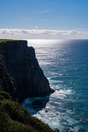 Towering rugged cliffs with green grass and rocky outcrops overlook a vast deep blue ocean with white-capped waves under a partly cloudy sky with...