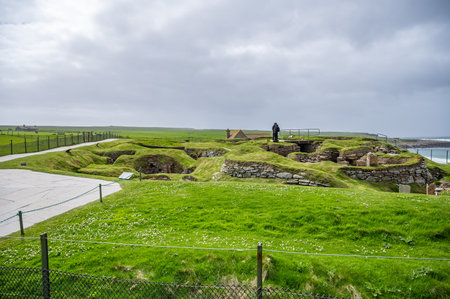 Skara Brae prehistoric village at Orkney Island, Scotland, wide angle shot