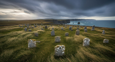 Weathered headstones in coastal landscape under dramatic cloudy sky