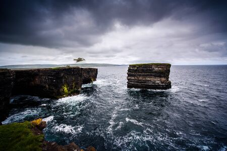 Ireland dramatic shoreline landscape. Waves crashing to rocky sea shore. Dramatic wild Ireland beautiful coast along wild atlantic way