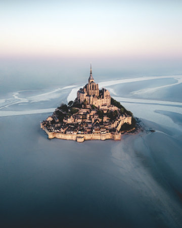 View of Normandy's beaches from the top, a wide shot of the sandy beach with buildings and people on it, in France. Photorealistic, in the style of Canon EOS R5. --ar 3:2 --v 6.1 Job ID: 78047540-dada-462d-a1f1-c7ecc1517937