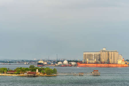 Makassar, Sulawesi, Indonesia - February 28, 2019: Evening shot of Pulau Khayangan island in front of the harbor. Brown concrete silos and large red Pan Begonia bulk carrier. City skyline.