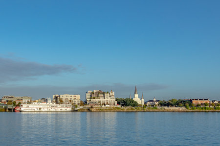 Scenic view of New Orleans skyline in morning light from river Mississippi, Louisiana, USA
