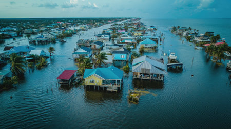 A compelling photo of a community affected by rising sea levels, with floodwaters encroaching on homes and infrastructure, reflecting the impact of climate change on coastal areas.