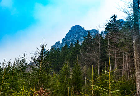Mystery beautiful fog descends from the mountains into a forest full of green pine trees in the Tatras.