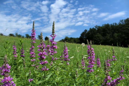 Beautiful pink wildflowers close up on background of mountain hills and sunny sky. Fireweed blooming flowers. Traveling and exploring Carpathians Mountains