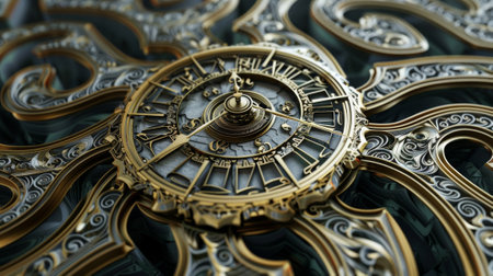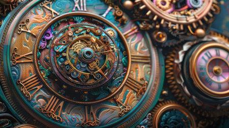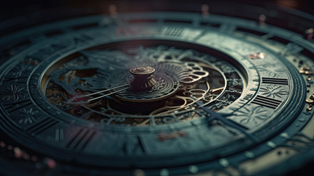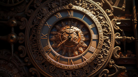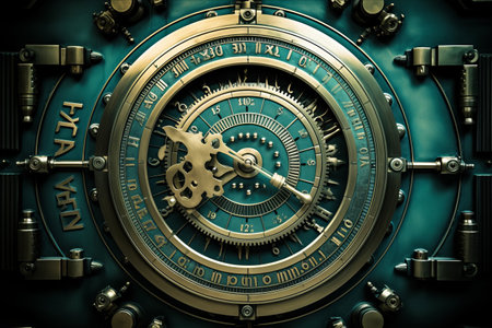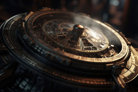 Photorealistic Time travel: a time machine. Close-up of a vintage clock, AI generated