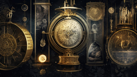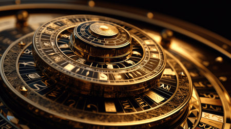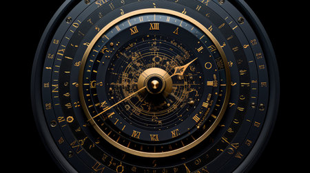 Intricate and dramatic close-up of a luxurious, dark antique astrological clock or celestial sphere, showcasing detailed golden zodiac signs, roman numerals, and shimmering star-like dust against a deep black cosmic background in a mystical