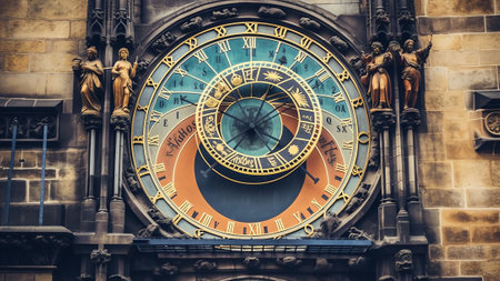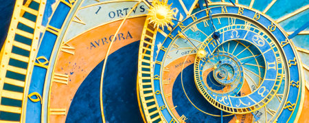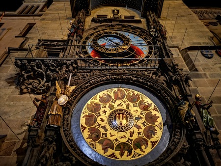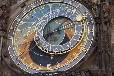Prague Astronomical Clock, or Prague Orloj. the astronomical dial, representing the position of the Sun and Moon in the sky and displaying various astronomical details background. Golden Roman numerals.