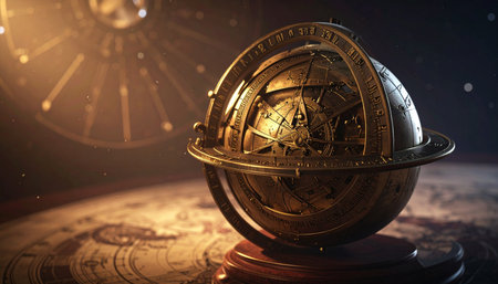 In a dimly lit study, a golden armillary sphere glows with ancient knowledge.