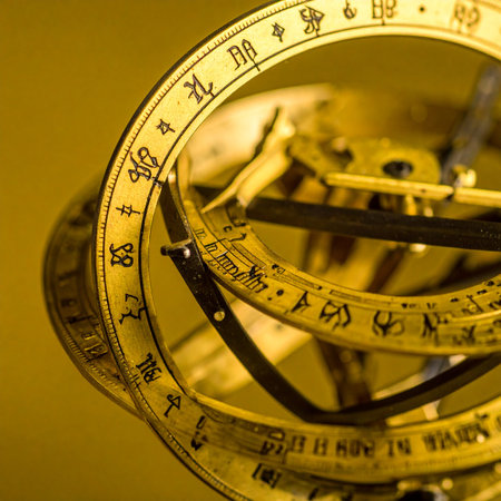 A detailed closeup of a golden antique armillary sphere, its rings etched with ancient celestial markings and zodiac symbols.
