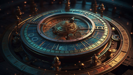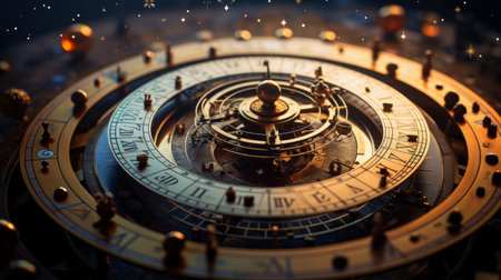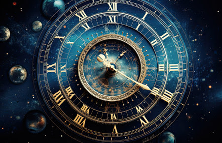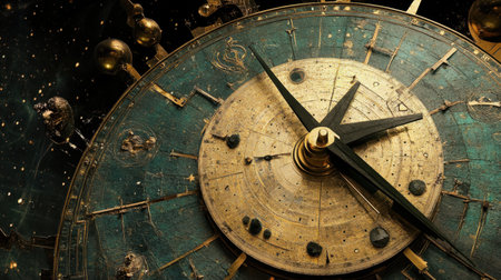 An astrological clock showcases detailed engravings and a stunning design revealing celestial pathways and time markers with a cosmic backdrop.