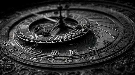 This image showcases a detailed antique clock, emphasizing its intricate metalwork. The composition features an overhead perspective with sharp focus, highlighting the circular design and Roman numeral markings. The monochrome palette of blacks and grays, along with the detailed texture, evokes a sense of history and classic design, suitable for various editorial and commercial applications.