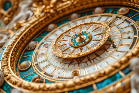a golden ornamented clock with green glass, featuring surreal cyberpunk iconography. this tabletop photograph showcases a dark cyan and bronze color scheme, along with fantastical machines and colorful woodcarvings. the clock, a zeiss ikon zm, stands against a mysterious backdrop, creating an intriguing and visually captivating image. ai generated