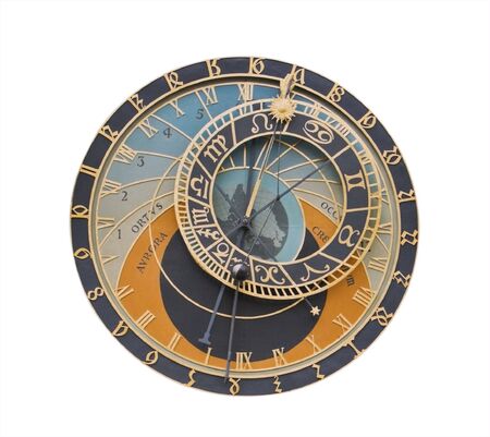 Astronomical clock from Prague isolated against a white background.