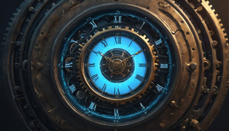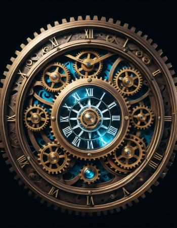 Steampunk clock with intricate gears and blue glow