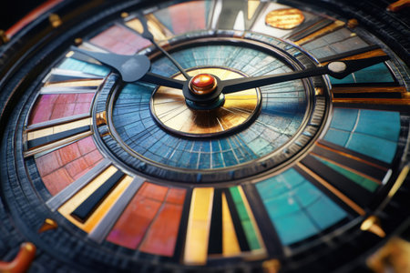 A golden clock with seven different colored numbers on it. Generative AI image.
