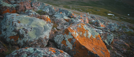 Colorful lichen patterns on rocks in the arctic tundra reveal natures artistry