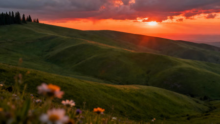 Mountain Ridge And Rolling Hills Under Soft Sunset Light With Expansive Scenic Views