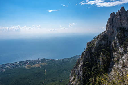 Picturesque view from Mount Ai-Petri to the village of Miskhor and the Black Sea, sharp cliffs in the foreground.
