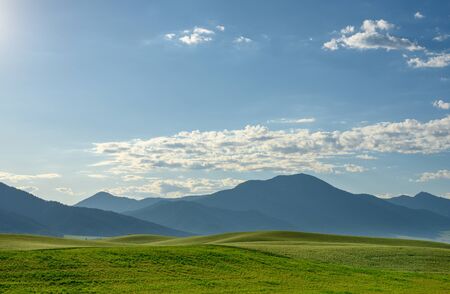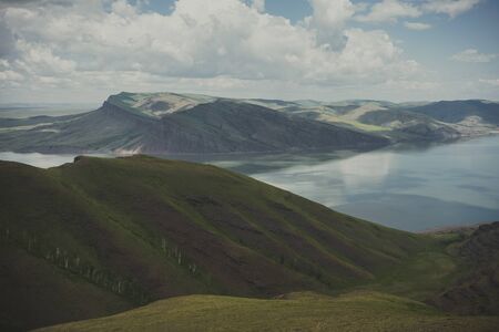 Mountain landscape, white clouds, lake and mountain range in the distance. Fantastic sunny day in mountains, large panorama. Location is in Altai, Russia.