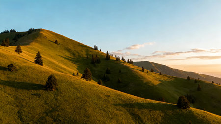 Landscape of green hills in the morning light. High quality photo