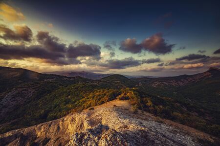 Sunset landscape overlooking the hilly coastal line in Crimea, Koktebel.