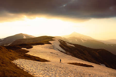 mountain peak sunset landscape with gloomy dramatic mainly cloudy sky and orange and red sun beams at snow