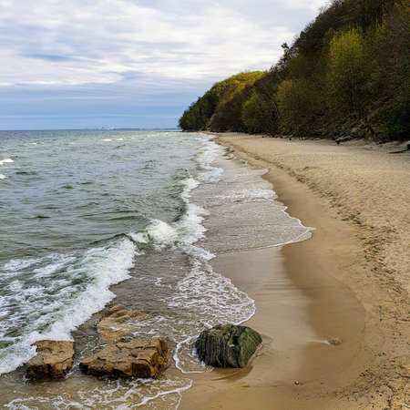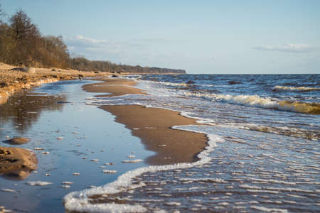 City Tuja, Latvia. Baltic sea beach with sand and rocks. Travel photo 24.04.2021
