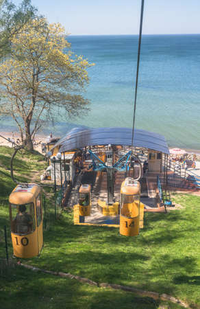 Svetlogorsk, Russia - may 11, 2021: yellow retro cable cars and Baltic sea view on sunny spring day