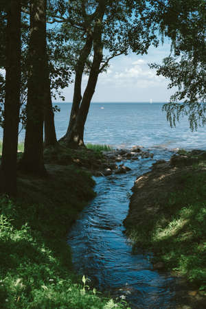 Evening on the Baltic Sea with an old lighthouse on the sandy shore. Trees with roots at the very edge of the water. Latvia