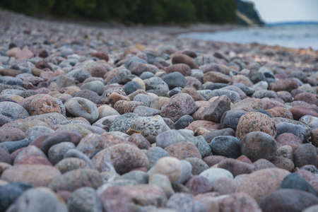 Steep bank on the Baltic sea coastline. Stones on the beach. Sunny day in summer. Waves in the background.