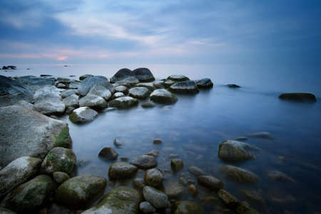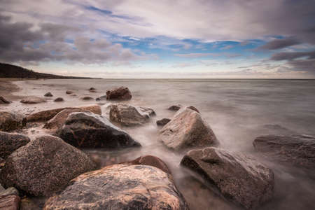 Beautiful long exposure landscape of rocky sea shore. Tranquil scene of Baltic sea.
