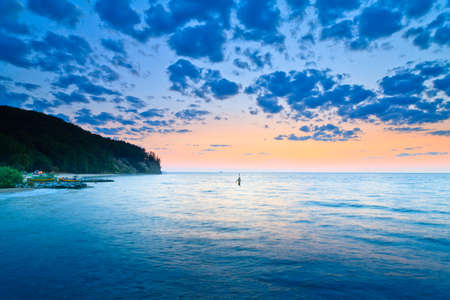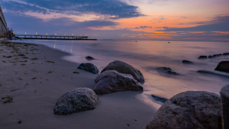 Beautifu rocky sea shore at sunrise or sunset. Long exposure landscape. Baltic sea near Gdynia in Poland.