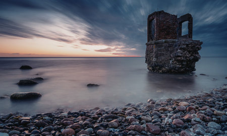 A serene coastal scene at sunset featuring crumbling ruins on a pebbled shore with calm waters and scattered rocks.