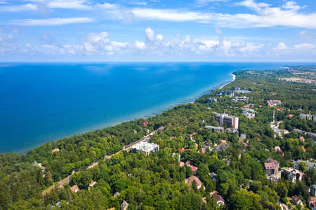 Baltic sea coastline with Svetlogorsk town. Aerial view from drone