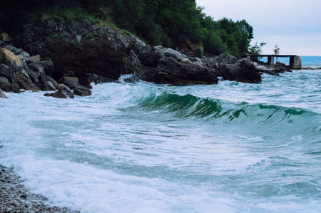 Rocks on the sea shore washed by the blue water of the sea and hit the rocks creating white splashes of water foam. Spring landscape on a warm day with blue skies.