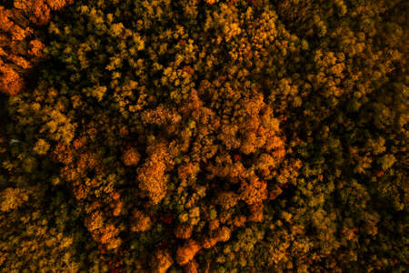 Aerial view of beautiful autumn forest at sunset. Top view of trees autumn colors.