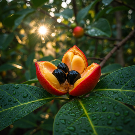 The Kakadu plum at sunset, Golden red sunset light filters through the leaves, still atmosphere, warm orange glow blending with natural green tones.