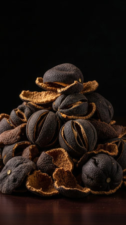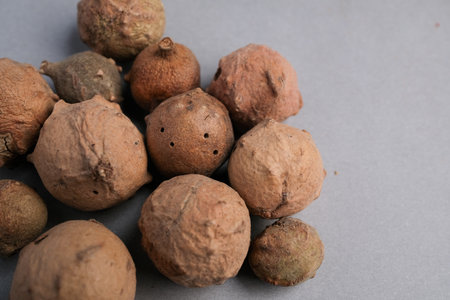 Macro Still Life of Natural Dried Oak Galls (Quercus infectoria) Showing Woody Structure and Holes, Rich in Tannins for Ink and Medicine.