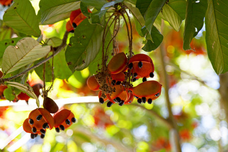 Orange color ripe Peanut Butter Fruit tree blooming in garden on nature background, food