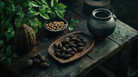 A rustic table setting featuring nuts, a cocoa pod, and a clay pot. The natural elements create a warm ambiance, perfect for food photography or kitchen decor.
