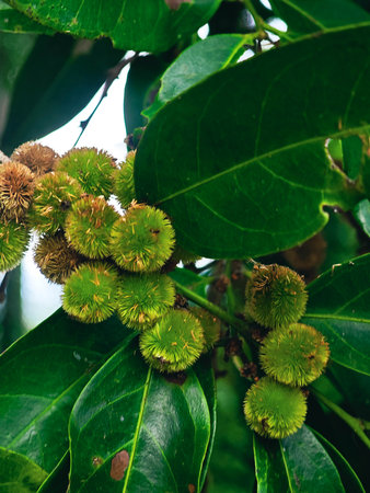 The Ackee in spring, fresh green leaves, soft sunlight filtering, vibrant atmosphere full of vitality, natural textures, serene mood.