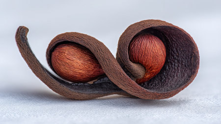 This captivating macro image features intricately curled brown seed pods, showcasing their unique textures and natural beauty on a soft white background, perfect for organic themes.