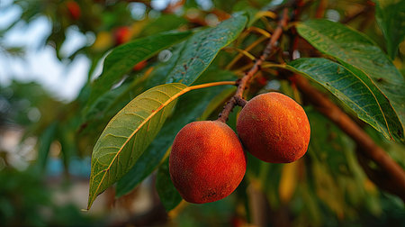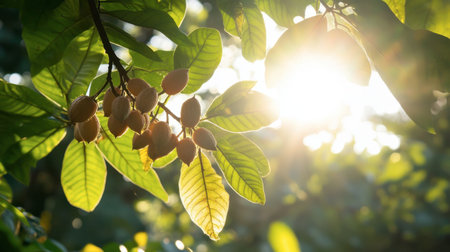 The Mamey sapote at sunset, Golden red sunset light filters through the leaves, still atmosphere, warm orange glow blending with natural green tones.