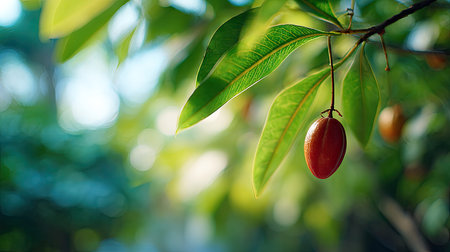 A detailed photograph of a single Miracle fruit, swaying gently in the wind, captured in natural daylight. Fresh and airy atmosphere, soft motion blur on leaves, crisp details on textures, background softly blurred into natural greenery, cinematic natural light, realistic photography style.
