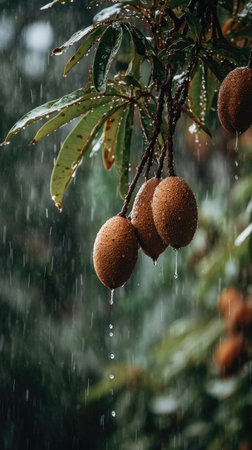 Soft rain falling gently on Mamey sapote, with water droplets forming and slowly dripping. The background is softly blurred with natural, moody atmosphere.