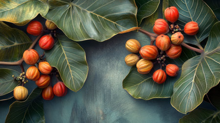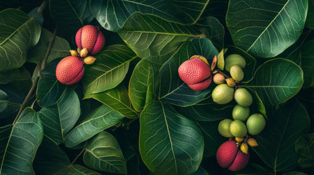 This image showcases vibrant tropical fruits nestled among lush green leaves, creating a rich, natural backdrop. Ideal for culinary, health, and botanical themes.