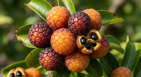 Fresh and vibrant longan fruit Beautiful green leaves add a touch of nature Ideal for use in food photography or design projects